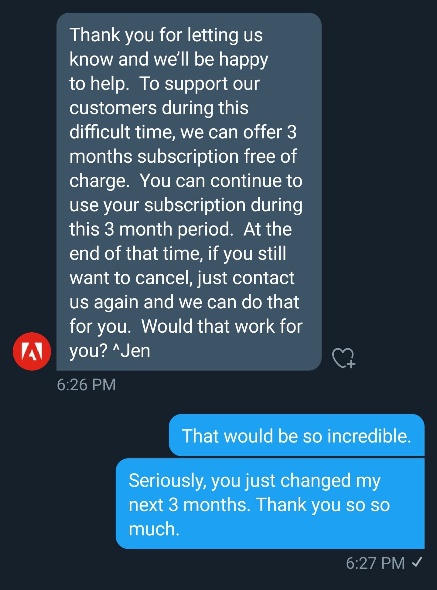 Give it about an hour for a person to message you back on Twitter. By then you should be all set and ready to receive your 90 day credit. The whole process is quick and painless, so I really applaud Adobe for both their understanding and their efficiency in this time of serious struggle caused by COVID-19.